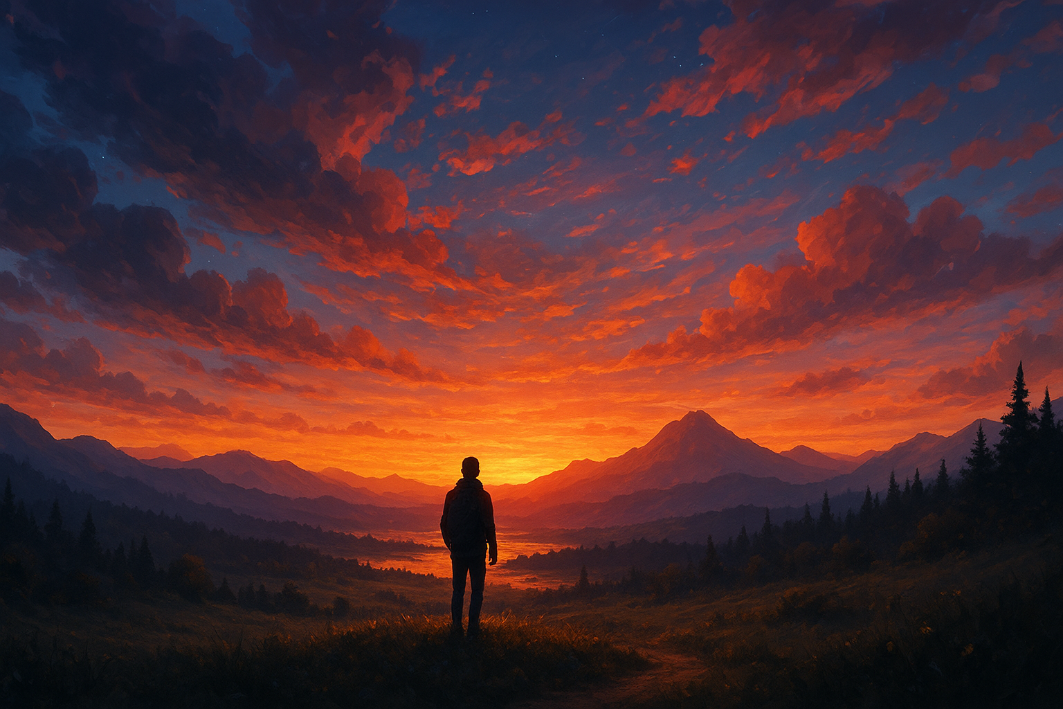 A person watches a glowing sunset over mountains and trees, surrounded by calm and peace.